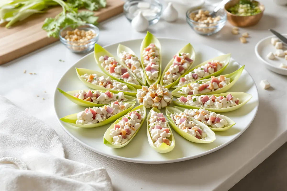 Les feuilles d’endive sont naturellement parfaites pour accueillir une garniture. Leur forme allongée et incurvée évoque de petites barques prêtes à être garnies. Une fois posées sur un plat, elles attirent immédiatement l’œil : le blanc de l’endive contraste joliment avec le rose du jambon.